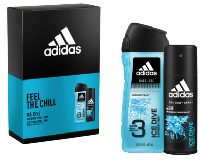 Adidas Ice Dive Bodyspray + Showergel is een giftset voor mannen die van frisse geuren houden. Douchezeep wordt gebruikt om het gezicht, het haar en het lichaam te wassen. Het frisse gevoel wordt gecompleteerd door Body Spray, waarvan de geur tot 48 uur op de huid blijft.