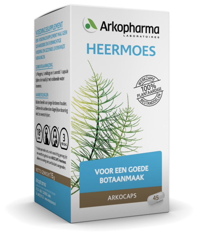 Heermoes poeder (Equisetum arvense, 72,3% hetzij 250 mg per capsule). Deze capsules bevatten alle actieve natuurlijke bestanddelen van het bovengronds steriel gedeelte, zonder enige toevoegingen van suiker, gist, conserveermiddelen, kleur - en smaakstoffen. Glutenvrij.
