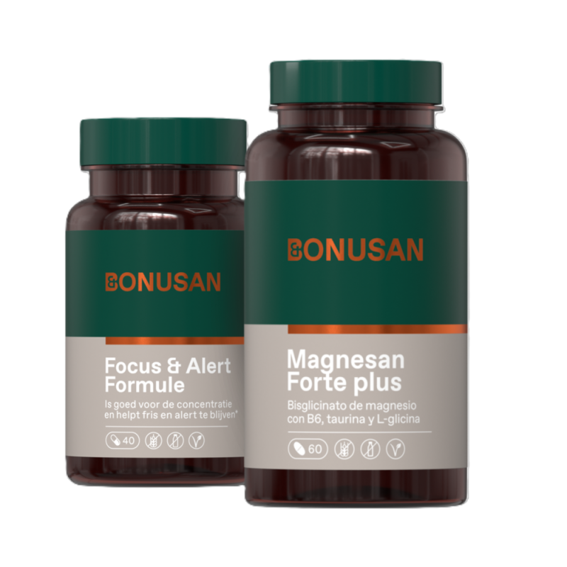 Bonusan Focus & Mentale Balans combineert twee krachtige formules voor het behoud van een heldere geest overdag enis gunstig voor een goede geestelijke balans in de avond. De Focus & Alert Formule is tijdens de volle dagen goed voor het concentratievermogen* dankzij Bacopa monnieri, terwijl de magnesiumin de Magnesan Forte Plus bijdraagt tot een normale werking van het zenuwstelsel en een normale psychologische functie. Met deze bundel blijf je fris en alert gedurende de dagén help je je lichaam om in de avond (weer) tot rust te komen. Zo blijf je scherp wanneer het écht nodig is, en in balans wanneer het mag.