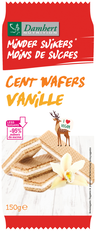 Damhert Centwafers Vanille is een lekkere snack voor jong en oud. Deze krokante minder suikers wafer gevuld met een heerlijk luchtige vanillecrème bevat 95% minder suikers dan een standaard wafer. Hiermee zijn ze een geschikte snack voor personen die op hun suikerinname willen of moeten letten. Ook vegan en vezelrijk.