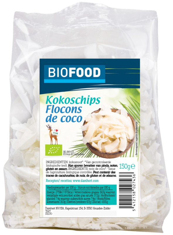 Damhert Kokoschips is chips die van kokosnoten worden gemaakt. Lekker om zo te eten, als gezonde vervanger van gewone chips of om toe te voegen aan yoghurt, een smoothie of salade.