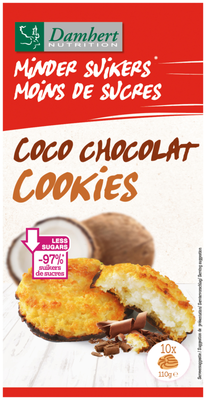 Damhert Low Carb Kokoskoek Chocolade zijn kokoskoekjes met chocolade en zoetstoffen. De koekjes zijn laag in suikers, maar hebben toch een heerlijke zoete smaak door toegevoegde zoetstoffen. Lekker als tussendoortje of bij de koffie/thee.