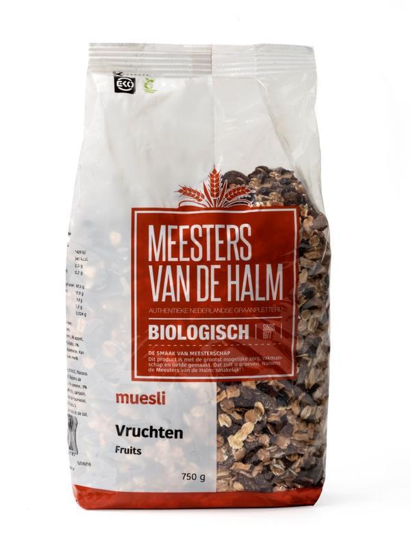 In de Vruchtenmuesli zijn de onderstaande ingrediënten verwerkt: 4-korenvlokken (haver, gerst, rogge en tarwe), rozijnen, krenten, zonnepitten, kasha, appel, abrikozen en pruimen.