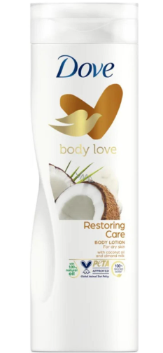 De Dove Bodylotion Restoring Ritual Coconut & Almond is een rijke lotion met kokosolie en amandelmelk, voor een hersteld en zacht gevoel.