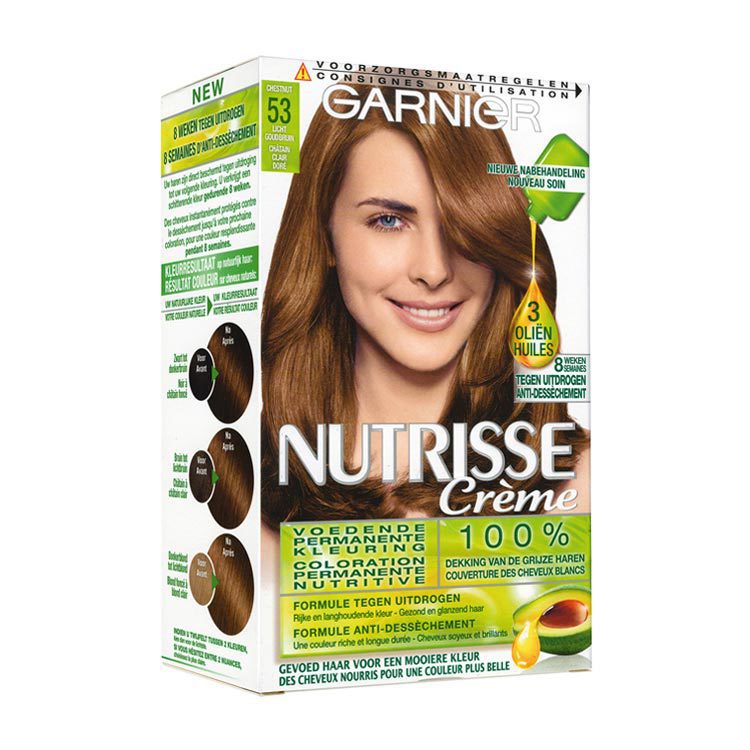 Garnier Nutrisse Haarkleuring 53 Noissette Licht Goudbruin is een makkelijke crèmeformule. De permanente haarkleuring is eenvoudig aan te brengen en drupt niet. De unieke formule bevat heerlijk geurende avocado- en druivenpitolie voor verzorging van de hoofdhuid en het haar. De haarkleuring geeft een rijke kleur en een langdurige glans. De optimale dekking camoufleert alle grijze haren. De verpakking bevat nu zelfs twee keer meer nabehandeling. Hierdoor kan je het meerdere malen gebruiken. De stralende kleur blijft voor minimaal zes weken behouden.