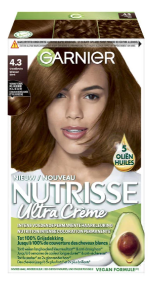 -23%Garnier Nutrisse Crème Permanente Haarverf 4.3 Goud Middenbruin betekent gevoed haar en daardoor een mooiere haarkleur. Nutrisse Crème is verrijkt met 4 oliën: avocado-, olijf-, karité- en cranberry-olie. Deze 4 oliën omhullen de haarvezel, wat zorgt voor extra voeding en sterker haar. Diep gevoed haar neemt de kleur niet alleen beter op, het houdt de kleur ook langer vast voor een rijke en mooiere kleur. Door de conditioner voelt uw haar zacht en gezond aan. Nutrisse Crème haarverf dekt 100% van de grijze haren. Zelfs de meest hardnekkige grijze haren worden gekleurd. De rijke crème van Nutrisse Crème drupt niet en is makkelijk aan te brengen. De frisse geur maakt het kleuren van het haar extra prettig.