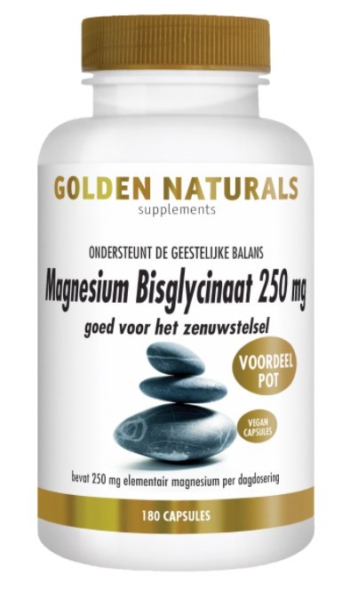 Golden Naturals Magnesium Bisglycinaat 250 mg is een optimale magnesiumvorm voor de hersenfunctie. Magnesium bisglycinaat is een magnesiumvorm die gemakkelijker de bloed-hersenbarrière bereikt. Dit voedingssupplement is verkrijgbaar in de vorm van capsules. Voor de ‘moeilijke slikker’ zijn capsules gemakkelijker in te nemen. Golden Naturals Magnesium Bisglycinaat 250 mg is geschikt voor volwassenen en kinderen vanaf de leeftijd van 3 jaar.