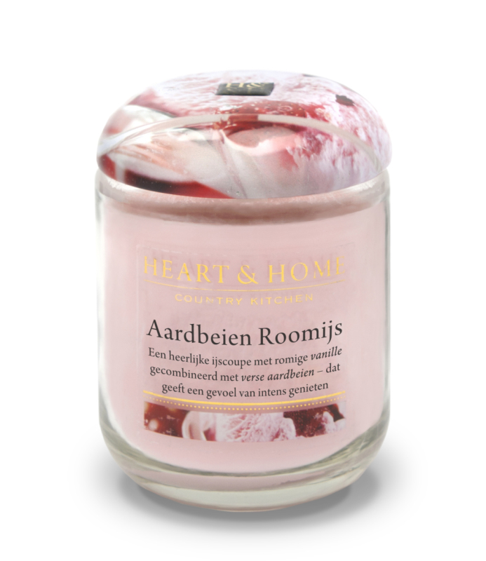 Heart & Home Grote Geurkaars - Aardbeien Roomijs is een geurkaars in glas met een heerlijke geur. Zoals velen zal jij ook intens genieten van deze geur van romig vanille ijs met verse aardbeien. Een lekkernij voor iedereen! Geniet nu tot wel 70 branduren van deze zoete geur. De Large Geurkaars - Aardbeien Roomijs behoort tot de 'Country Kitchen’ lijn.