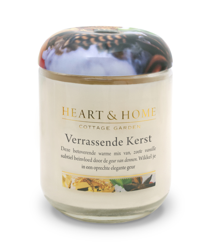 Heart & Home Grote Geurkaars – Verrassende Kerst is een geurkaars in glas. Een heerlijke geur voor tijdens de feestdagen. Het sentimentele moment van samenzijn is perfect omvat in deze mooie geurkaars. De zoete tonen van vanille in combinatie met de geur van dennen slepen je mee. Geniet van deze mooie, elegante geur tot wel 70 branduren lang. De Large Geurkaars - Verrassende Kerst is een onderdeel van de ‘Pure Bliss’ kaarsen.