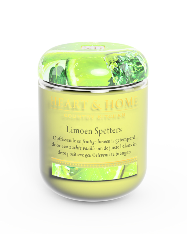 Heart & Home Middelgrote Geurkaars - Limoen Spetters is een geurkaars in glas met een frisse noot van citrusvruchten. De friszure aroma wordt getemperd door de toevoeging van zachte vanille. Een unieke combinatie met een perfecte balans. De Medium Geurkaars - Limoen Spetters behoort tot de 'Country Kitchen' kaarsen.