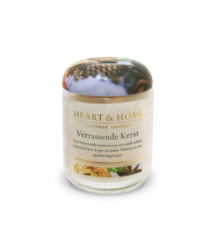 Heart & Home Middelgrote Geurkaars - Verrassende Kerst is een perfecte geurkaars in glas voor de feestdagen. De betoverende geuren van dennen, zoete vanille en andere kruiden omschrijven het ultieme gevoel van kerst. Een kaars die je tijdens de feestdagen kunt branden, maar ook wanneer je het heerlijke gevoel van samenzijn weer even wilt ervaren. De Medium Geurkaars - Verrassende Kerst behoort tot de lijn ''t Is The Season'.