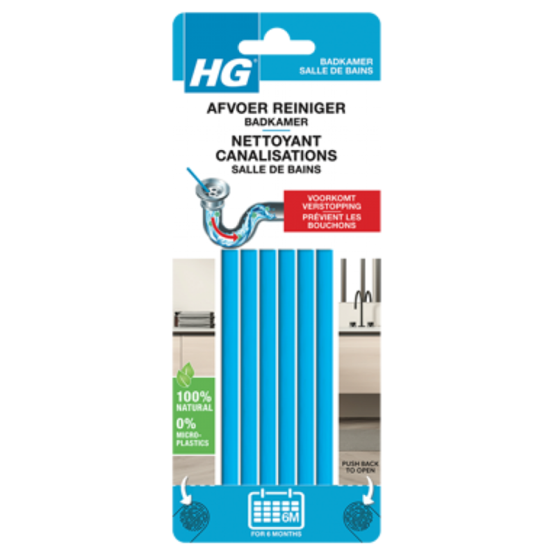 Gebruik maandelijks één HG Afvoerreiniger Stick om vervelende luchtjes en verstoppingen te voorkomen. De stick bevat enzymen die langzaam oplossen en zeepresten, huidvetten, huidschilfers en ander vuil afbreken. Elke verpakking bevat 6 sticks, genoeg voor een half jaar onderhoud bij normaal gebruik van wastafel, douche of bad. Is je afvoer intensief in gebruik? Dan kun je de sticks gerust vaker gebruiken.