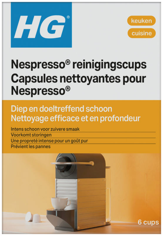 Het met druk zetten van koffie zorgt voor een aanslag van resten koffie en koffievet in het gedeelte van uw Nespresso machine waar de koffie wordt gezet (de zogeheten cuphouder) en in het uitstroompijpje. Elke keer als er koffie wordt gezet, wordt iets van deze aanslag meegenomen door de verse koffie en dit heeft een nadelig effect op de smaak hiervan. Wat erger wordt naarmate de aanslag langer blijft zitten en zich verder ophoopt. Het regelmatig reinigen van de Nespresso cuphouder is daarom van belang. Speciaal hiervoor zijn de HG Nespresso® reinigingscups ontwikkeld.