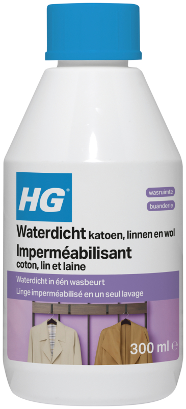 HG waterdicht katoen, linnen, wol en gemengde textielsoorten is geschikt voor onder andere kinderkleding, regenkleding, spijkergoed, meubelhoezen, tuinmeubelhoezen, tafellakens. Voor parasols, zonneschermen, grondzeilen en dergelijke en 100% synthetische vezels, adviseren wij HG 4 in 1 beschermer voor textiel.