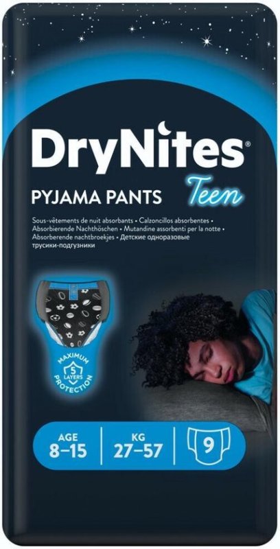 Huggies DryNites Boy 8-15 Jaar is anatomisch gevormd incontinentie-ondergoed voor jongens van 8 tot 15 jaar. Het wegwerp incontinentie-ondergoed kan worden aan- en uitgetrokken als normaal ondergoed. Het is voorzien van een dunne absorberende laag en een waterafstotende buitenkant. Het ondergoed voelt zacht aan en zit als normaal ondergoed. Lekkage aan de benen wordt voorkomen door anti-lekrandjes. De zijkanten zijn elastisch en zorgen voor een goede pasvorm. Huggies Drynites Boy 8-15 jaar is bedrukt met motieven voor jongens en onopvallend te dragen onder kleding.
