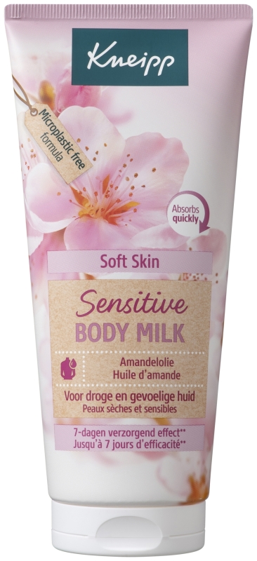 Kneipp Sensitive Body Milk Amandelolie beschermt de huid tegen uitdrogen en schadelijke invloeden van buitenaf. De bestanddelen amandelolie, essentiële vetzuren en vitamine E hydrateren je huid. De lotion bevat geen kleurstoffen, geen conserveringsmiddelen en is PH-huidneutraal. Dit product is dermatologisch getest. Naast hoogwaardige amandelolie die zeer geschikt is voor de gevoelige huid, bevat de verzorgende milk celbeschermende vitamine E, rijke sheabutter en huidkalmerende panthenol.