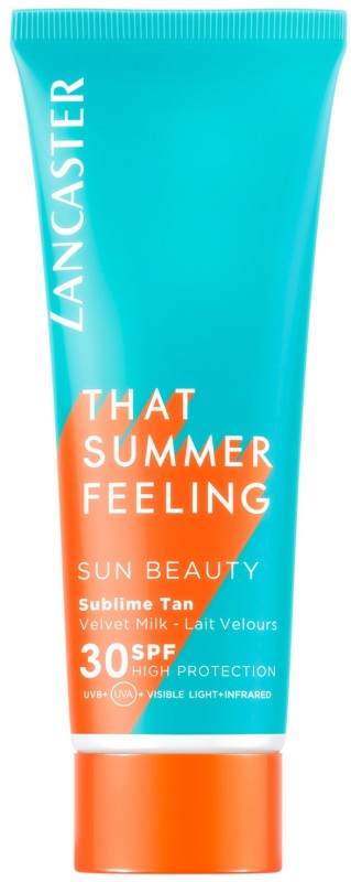 De Lancaster Sun Beauty Sublime Tan Velvet Milk SPF30 zonbescherming is uitgevoerd in oranje en turquoise. De formule zorgt voor een sublieme, goudkleurig bruine kleur en houdt deze tint langer vast. De uitgebreide bescherming, de Full Light Technology, is niet alleen effectief tegen uvb- en uva-stralen, maar het beschermt de huid ook tegen het zichtbare licht en infrarood licht.