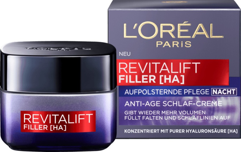 L'Oréal Paris Revitalift Filler Nachtcrème is een nachtcrème met hooggeconcentreerd hyaluronzuur. Tijdens de nacht gaat de huid zichzelf herstellen en de hyaluronzuur helpt hierbij. De rimpels en slaaplijntjes worden opgevuld en de huid wordt voller. Deze crème is verrijkt met Galanga, een plantaardig extract. Dit product is geschikt voor vrouwen vanaf 35 jaar.