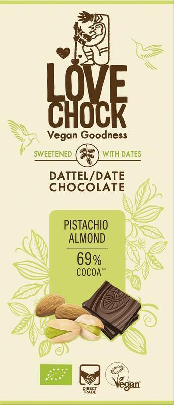 Biologische pure chocolade gezoet met dadels, pistache en amandel - ten minste 69% cacaobestanddelen.