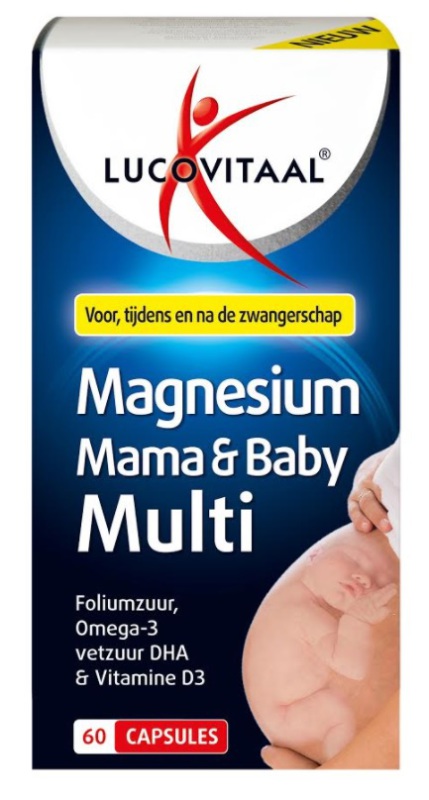 Lucovitaal Magnesium Mama & Baby Multi is een compleet voedingssupplement, speciaal ontwikkeld voor vrouwen met een zwangerschapswens, maar ook voor zwangere vrouwen en de periode ná de zwangerschap. Het supplement is verrijkt met onder andere vitaminen, magnesium, foliumzuur, betacaroteen en het omega 3 vetzuur DHA. Een rijke samenstelling die de groei van de foetus ondersteunen. Lucovitaal Magnesium Mama & Baby Multi is de meest complete formule met vitaminen, mineralen en omega-3 vetzuur DHA voor moeder en kind.