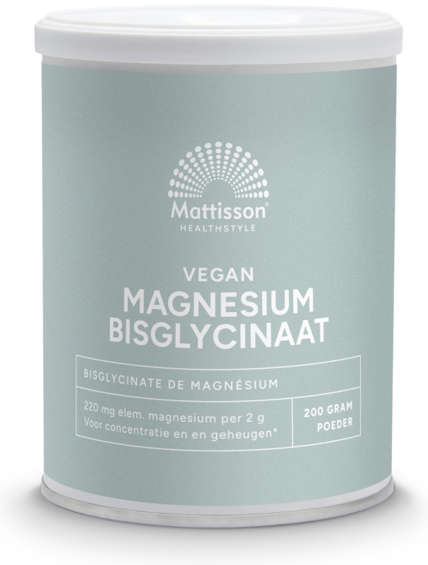 Mattisson Magnesium Bisglycinaat Poeder Met 11,4% Elementair Magnesium is een vorm van magnesium die gemakkelijk door het lichaam opgenomen kan worden. Magnesium is onmisbaar voor de energieproductie, de werking van spieren en zenuwen en voor het behoud van de stevigheid van botten. De helft van de magnesium in het lichaam bevindt zich in het bot. Magnesium komt voor in heel veel voedingsmiddelen.