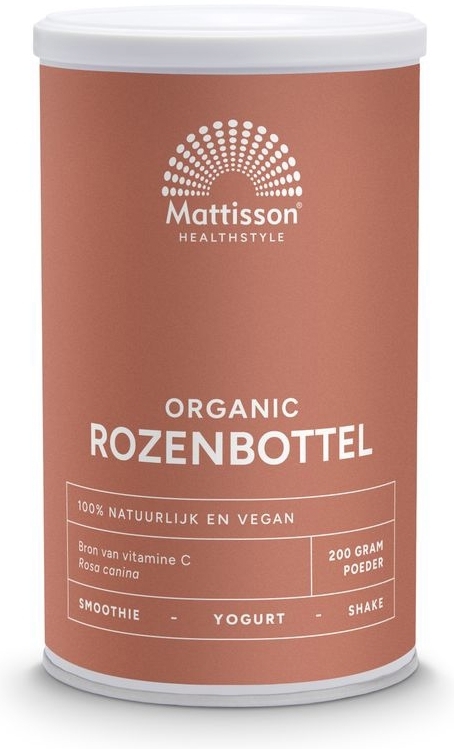 Mattisson Rozenbottel Poeder Biologisch bevat rozenbottel poeder. Rozenbottel poeder is gemaakt van rijpe en gedroogde rozenbottels. De rozenbottel is de vlezige vrucht van een roos. De vorm en de kleur van de vrucht kunnen variëren en zijn afhankelijk van de herkomst. Rozenbottel poeder bevat van nature veel vitamine C. Vitamine C heeft een positieve invloed op het immuunsysteem en draagt bij tot de vermindering van vermoeidheid en moeheid.