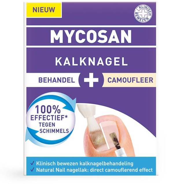 Mycosan Kalknagel Behandel + CamoufleerMycosan Behandel + Camoufleer is speciaal ontwikkeld voor de effectieve behandeling van kalknagels en om direct de verkleurde nagel er mooier uit te laten zien, wanneer u dit nodig heeft. Ideale oplossing voor de effectieve behandeling van kalknagels als u open schoenen of slippers wilt dragen.* Gepatenteerd serum: stopt de ontwikkeling van schimmels die kalknagel veroorzaken* Precisie kwast: voor de juiste dosering op de moeilijk bereikbare plekken* Met Natural Nail nagellak: camoufleert verkleuringen direct * 10 x nagelvijl: voor betere werking. Door het vijlen bereikt het serum de schimmel beterAanwijzingen voor het gebruik1. ACTIEVE BEHANDELINGReinig en droog de nagels voor gebruik en verwijder alle sporen van nagellak (met gewone nagellak remover) voor gebruik van het serum. Gedurende 4 weken 2 x daags een kleine druppel serum aanbrengen op de kalknagel. Een kleine druppel is voldoende. Laat het serum 1 minuut drogen. Na 4 weken het serum 1 x daags aanbrengen tot het aangetaste deel van de nagel volledig is uitgegroeid.2. NATURAL NAIL LAK Aanbrengen zodra serum volledig droog is. Aanbrengen wanneer camoufleren verkleuring van de kalknagel gewenst is. Zo nodig herhalen.3. VIJLEN IS BELANGRIJK Na een week behandelen met Mycosan Kalknagel serum, start u voorzichtig met het vijlen van het aangetaste oppervlak van de nagel met de bijgeleverde vijltjes. Door het vijlen dringt het serum nog beter door in de nagel voor beter en optimaal resultaat.BestanddelenIngredienten Mycosan Kalknagel (Medisch hulpmiddel):Aqua, rye ferment filtrate, pentylene glycol, dimethyl isosorbide, hydroxyethylcellulose.Ingredienten Mycosan Natural Nail (cosmetisch product):Butylacetate, Ethyl acetate, Nitrocellulose, Adipic acid/neopentyl glycol/ trimellitic, anhydride copolymer, Acetyl tributyl citrate, Isopropyl alcohol, Silica, Stearalkonium hectorite, Titanium dioxide/CI 77891, Citric acid, Red 6/CI 15850.WaarschuwingenBuiten bereik van kinderen bewaren.Overige informatieMedisch hulpmiddel. Lees voor gebruik de gebruiksaanwijzing.FabrikantSerrix B.V. Herengracht 4581017 CA, Amsterdam