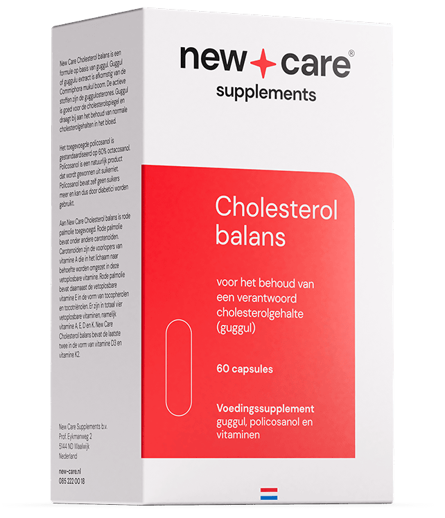 New Care Cholesterol Balans is een voedingssupplement op basis van guggul. Guggul, ook wel Guggulu extract, komt van de Commiphara mukul boom en bevat de actieve stoffen guggulosterones. Het ingrediënt is goed voor de cholesterolspiegel en draagt bij aan het behoud van normale cholesterolgehalten in het bloed. Het toegevoegde policosanol is gestandaardiseerd op 60% octacosanol. Policosanol is een natuurlijk product dat wordt gewonnen uit suikerriet. Policosanol bevat zelf geen suikers meer en kan dus door diabetici worden gebruikt.