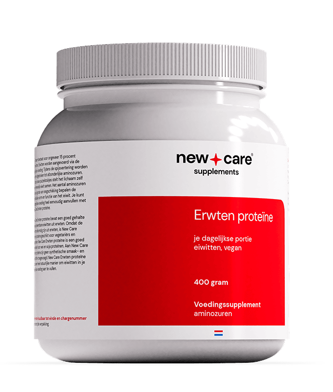 New Care Erwten proteïne bevat een goed gehalte goed opneembare eiwitten uit erwten. Omdat de eiwitten afkomstig zijn uit erwten, is New Care Erwten proteïne ook geschikt voor vegetariërs en veganisten. New Care Erwten proteïne is een goed alternatief voor wei en soja proteïnen. Aan New Care Erwten proteïne zijn geen synthetische smaak- en zoetstoffen toegevoegd. New Care Erwten proteïne is dus een heel natuurlijke manier om eiwitten in de dagelijkse voeding aan te vullen.
