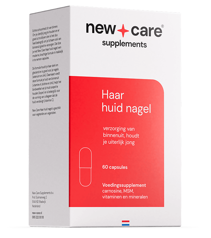 New Care Haar Huid Nagel houdt je haar sterk en glanzend en is goed voor je nagels (selenium en zink). Daarnaast voedt deze formule je huid van binnenuit (vitamine A, biotine en zink), helpt het bindweefsel van je huid soepel te houden (koper) en is belangrijk voor de vorming van collageen dat je huid verstevigt (vitamine C). Dit voedingssupplement is geschikt voor vegetariërs en veganisten.