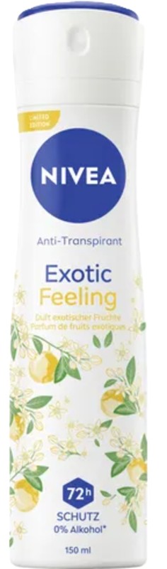 -38%Nivea Deo Spray Exotic Feeling met 72 uur betrouwbare anti-transpirant bescherming. De deodorant spray zorgt niet alleen voor zachte, gladde en mooie oksels, maar ruikt ook heerlijk naar exotisch fruit. Laat je zintuigen prikkelen door de exotische geur van tropische vruchten. Je huid wordt daarnaast intens verzorgd en beschermd. De formule met 0% alcohol (zonder ethylalcohol) is zacht voor je huid en helpt irritaties te voorkomen, zodat je oksels glad en verzorgd aanvoelen. Geniet van een frisse, fruitige geur die je de hele dag vergezelt. Dermatologisch bewezen huidvriendelijkheid zorgt voor een veilig en comfortabel gebruik, elke dag opnieuw.