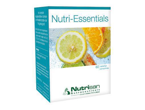 Nutrisan Nutri-EssentialsMulti-preparaatHet complete hoogkwalitatieve vitaminen- en mineralencomplex voor het behoud van uw gezondheid!Met Nutri-Essentials beschikt u over een adequate hoeveelheid aan essentiële voedingsstoffen om tekorten in de voeding aan te vullen.- Vitaminen A, B6, B12, C en D, ijzer, folaat, koper, selenium en zink ondersteunen een normale werking van het immuunsysteem.- Vitaminen B2, B5, B6 en C, ijzer, folaat en magnesium helpen bij de vermindering van vermoeidheid.Samenstelling per tabletVitamine C (calciumascorbaat)60 mg (75% RI*)Calcium (calciumbisglycinaat)60 mg (7,5% RI*)Choline (cholinebitartraat)40 mgMagnesium (magnesiumbisglycinaat)30 mg (8% RI*)Vitamine B3 (nicotinamide)22,5 mg (141% RI*)Citrus bioflavonoïden20 mgInositol20 mgVitamine E (d-alfa-tocoferylacetaat)15 mg (125% RI*)PABA15 mgBetaïne HCL10 mgVitamine B5 (calcium-D-panthotenaat)9 mg (150% RI*)Rutine7,5 mgZink (zink mono-L-methioninesulfaat)5 mg (50% RI*)Vitamine B6 (pyridoxal-5-fosfaat)3 mg (214% RI*)Vitamine B2 (riboflavine)2,4 mg (171% RI*)Vitamine B1 (thiaminemononitraat)2,1 mg (191% RI*)Vitamine A (Bètacaroteen en retinylacetaat)0,34 mg (43% RI*)Ijzer (ijzerbisglycinaat)1,25 mg (9% RI*)Koper (koperbisglycinaat)0,15 mg (15% RI*)Mangaan (mangaanbisglycinaat)0,5 mg (25% RI*)Foliumzuur (pteroylmonoglutaminezuur0,2 mg (100% RI*)Biotine75 mcg (150% RI*)Chroom (chroompicolinaat)75 mcg (187,5% RI*)Jodium (kaliumjodide)50 mcg (33% RI*)Molybdeen (natriummolybdaat)37,5 mcg (75% RI*)Selenium (L-selenomethionine)25 mcg (45% RI*)Vitamine D3 (cholecalciferol)3,10 mcg (62% RI*)Vitamine B12 (methylcobalamine)1,5 mcg (60% RI*)*RI: Referentie inname IngredientenVitamine C (Ca/Mg ascorbaat), Calcium (calcium glycinaat), Magnesium (magnesium glycinaat), Cholinebitartraat, Vitamine B3 (nicotinamide), Citrus bioflavonoïden, Inositol, Vitamine E (d-alfa-tocoferylacetaat), PABA, Betaïne HCL, Vitamine B5 (calcium panthotenaat), Rutine, Zink (zinkmonomethionine), Vitamine B6 (pyridoxine HCL), Hesperidine, Vitamine B2 (riboflavine), Vitamine B1 (thiamine mononitraat), Betacaroteen (mix van carotenoïden - Betatene), IJzer, Koper (koperglycinaat), Mangaan (mangaanglycinaat), Vitamine B9 (foliumzuur), Biotine, Chroom (picolinaat), Vitamine A (retinyl acetaat), Jodium (kaliumjodide), Molybdeen (sodium molybdaat), Selenium (selenomethionine), Vitamine D3 (cholecalciferol), Vitamine B12 (methylcobalamine), Hulpstoffen: Siliciumdioxide (antiklontermiddel), magnesiumstearaat (smeermiddel), microkristallijne cellulose (vulstof), coating (aquapolish)Gebruik:2 x 1 tablet per dag, liefst bij het ontbijt en middagmaal of volgens advies van een deskundige.Nutri-Essentials laat zich goed combineren met NutriOxyd.Raadpleeg voor gebruik uw arts in geval van zwangerschap of borstvoeding.De inname dient beperkt te worden tot enkele weken/maanden.Dit voedingssupplement is niet geschikt voor kinderen tot en met 10 jaar.Koel en droog bewaren.Fabrikant/DistributeurNutrisan NVOude Molenstraat 949100 Sint-NiklaasBelgiëDit product is een voedingssupplement.Een gevarieerde, evenwichtige voeding en een gezonde levensstijl zijn belangrijk. Een voedingssupplement is geen vervanging van een gevarieerde voeding.Aanbevolen gebruik niet overschrijden.Buiten bereik van jonge kinderen houden.Droog, afgesloten en bij kamertemperatuur bewaren, tenzij anders geadviseerd op het etiket.Raadpleeg een deskundige alvorens supplementen te gebruiken in geval van zwangerschap, lactatie, medicijngebruik en ziekte.