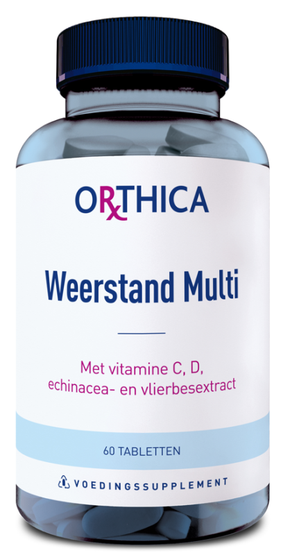 Orthica Weerstand Multi met vitamine C, vitamine D, echinacea- en vlierbesextract ter ondersteuning van de weerstand. In deze complete multi zijn vitaminen en mineralen met plantenextracten gecombineerd die het immuunsysteem ondersteunen zoals echinacea en vlierbessen. Geschikt voor iedereen vanaf 12 jaar.
