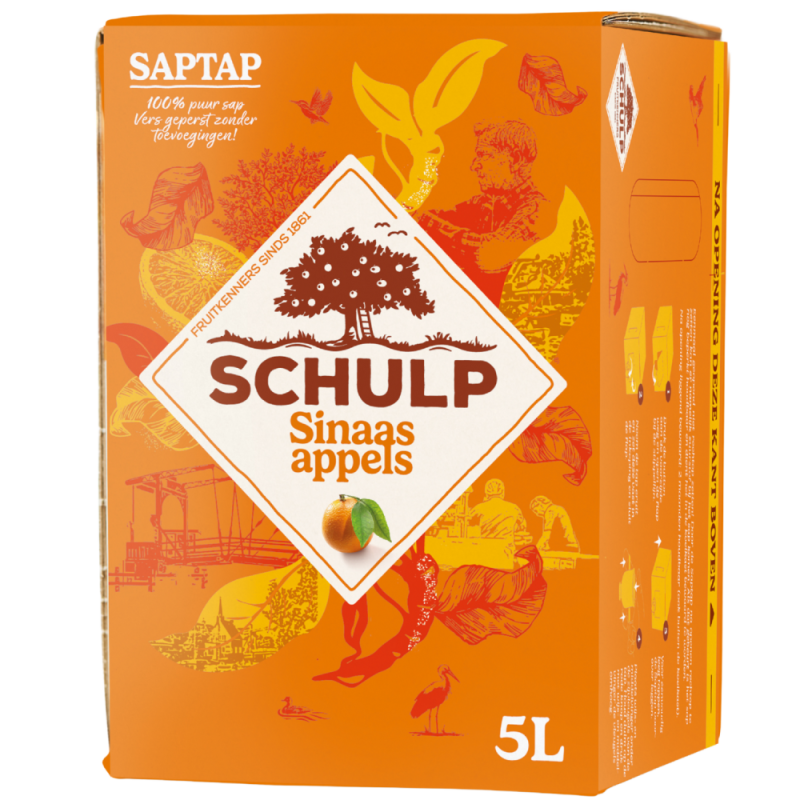 Schulp Sinaasappel SapTap met versgeperst sinaasappelsap in een handige 5 liter-verpakking.