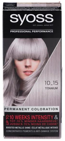 Syoss Permanent Coloration 10-15 Titanium is een permanente haarkleuring met kleurpigmenten die diep in het haar doordringen. Dit zorgt voor een kleurintensiteit tot 10 weken lang en een professionele grijsdekking. Daarnaast zorgt de SalonPlex technologie ervoor dat gebroken haarbruggen diep in het haar worden hersteld. De formule met Keratine verzegelt de haarschubben, voor een gladder en sterker haaroppervlak.