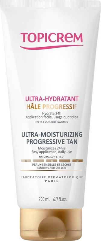 De Topicrem Ultra-Hydraterende Geleidelijke Bruining valt onder de Ultra-Hydraterende lijn. De producten die hieronder vallen hydrateren in alle veiligheid intensief de gevoelige en droge huid.