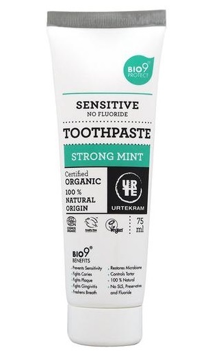 Urtekram Tandpasta Strong Mint Sensitive is een tandpasta met een frisse mintsmaak zonder fluoride en alcohol. Het is speciaal voor gevoelige tanden en is 100% biologisch, Ecocert gecertificeerd, vegan en dierproefvrij. Het herstelt het natuurlijke immuunsysteem van de mond en gaat gaatjes, tandplak en gingivitis tegen.