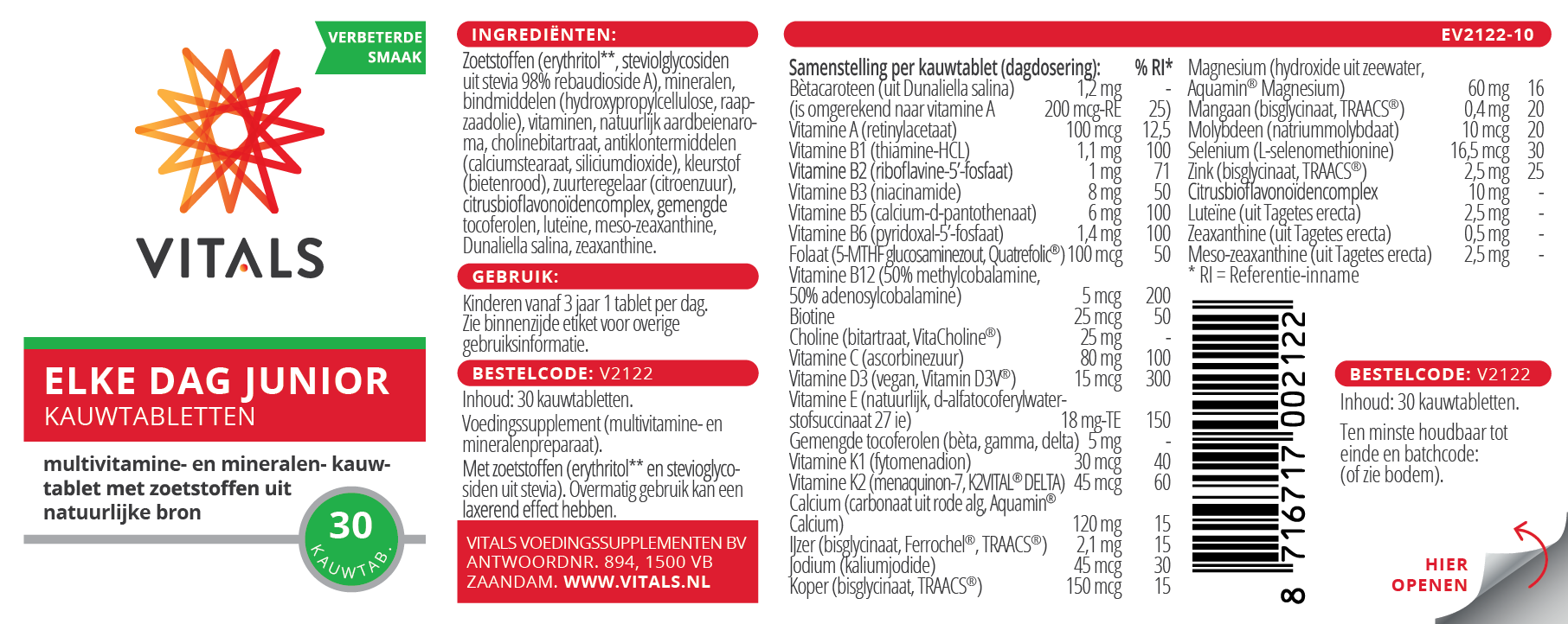 - Met 15 mcg vitamine D3 en 45 mcg vitamine K2 per kauwtablet;