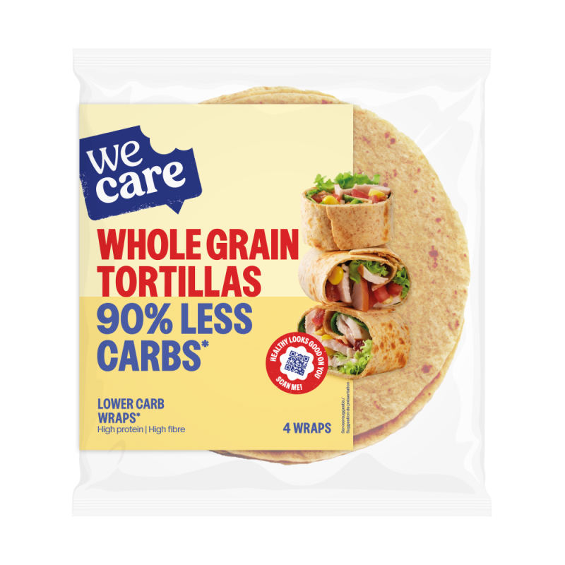 De WeCare Lower Carb Tortillas Whole Grain bevat 90% minder koolhydraten dan gewone wraps en zijn rijk aan eiwitten en vezels. Perfect als basis van een gezonde lunch, avondmaaltijd of voor tussendoor.